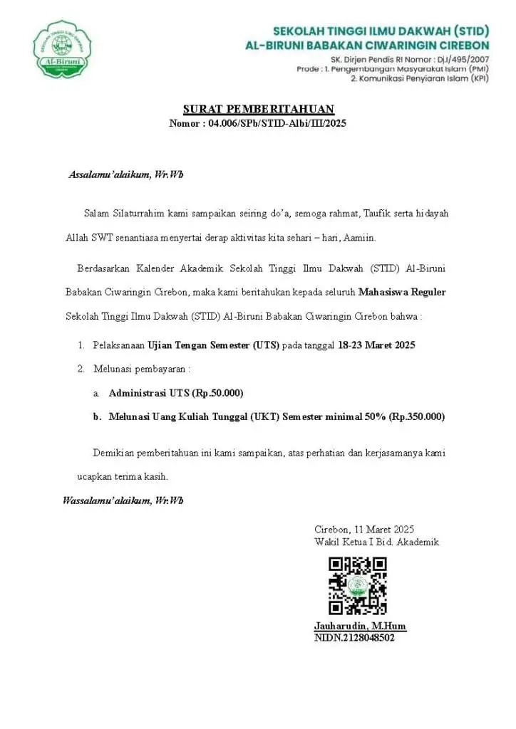 Beranda » NEWS » PENGUMUMAN JADWAL UTS REGULER SEMESTER GENAP 2024-2025 STID AL-BIRUNI BABAKAN CIWARINGINPENGUMUMAN JADWAL UTS REGULER SEMESTER GENAP 2024-2025 STID AL-BIRUNI BABAKAN CIWARINGIN SofyanMaret 14, 2025 Sharing is Caring 2 tanggapan pada “PENGUMUMAN JADWAL UTS REGULER SEMESTER GENAP 2024-2025 STID AL-BIRUNI BABAKAN CIWARINGIN” MUKAMAD ASLAKH Maret 15, 2025 pada 4:33 pm BalasSemakin baik dan semakin maju Sofyan Maret 17, 2025 pada 1:25 pm BalasAlhamdulillah berkat mahasiswanya yang cerdas2 dan aktif.Tinggalkan Balasan Batalkan balasanAlamat email Anda tidak akan dipublikasikan. Ruas yang wajib ditandai *Nama * Email * Situs Web Komentar * Simpan nama, email, dan situs web saya pada peramban ini untuk komentar saya berikutnya. sebelumnyaRAPAT LAPORAN PERTANGGUNG JAWABAN PANITIA WISUDA KE-8 STID AL-BIRUNI BABAKAN CIWARINGIN CIREBON TELAH DILAKSANAKANselanjutnyaSTID AL-BIRUNI SIAP GELAR SIDANG SEMINAR PROPOSAL SKRIPSI GELOMBANG 1