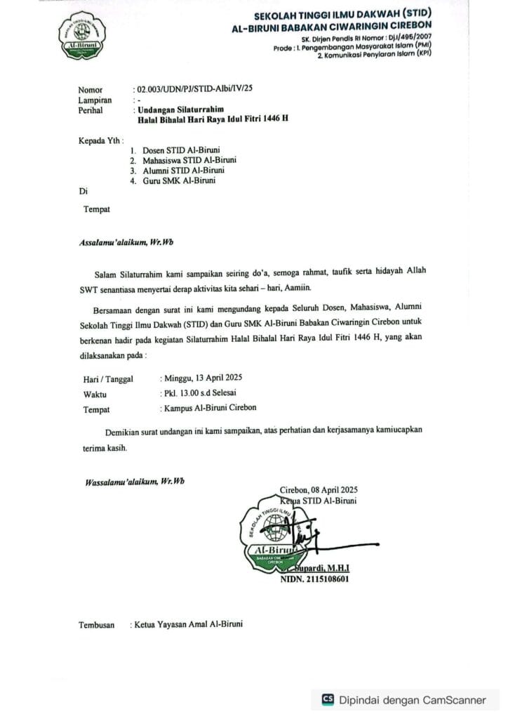 Semoga acara silaturahmi dan halal bihalal ini dapat mempererat tali persaudaraan dan memperkuat ukhuwah Islamiyah di lingkungan STID Al-Biruni Babakan Ciwaringin. Semoga Allah SWT senantiasa memberikan keberkahan dan kesuksesan bagi kita semua. Aamiin.